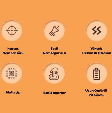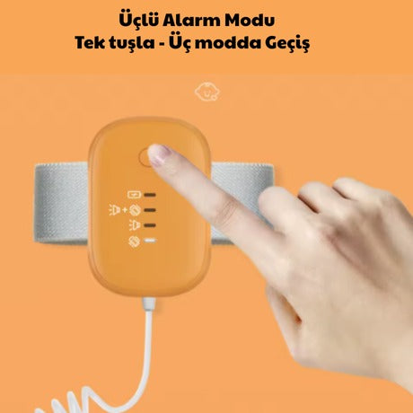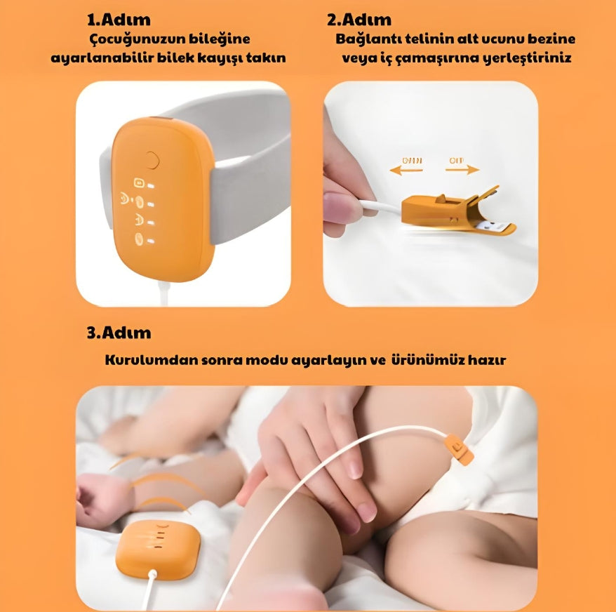 Alarm, çocuğunuzun iç çamaşırına takılan hassas bir nem sensörü kullanır. Islaklık ilk fark edildiğinde, çocuğunuzu uyandırmak için bir alarm ve hafif bir titreşim tetikler ve tuvalete gitme ihtiyacını fark etmesine yardımcı olur.